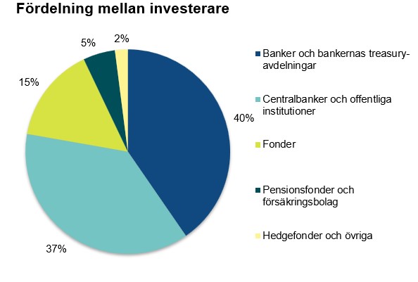 Geografiskt såldes den största andelen av lånet (36 %) till investerare i Benelux-länderna och Frankrike. Asien och Mellanöstern tilldelades 20 %, och Norden 15 %. Bland investerartyperna gick de största allokeringarna till banker och bankernas treasury‑avdelningar (40 %) samt till centralbanker och andra offentliga institutioner (37 %).