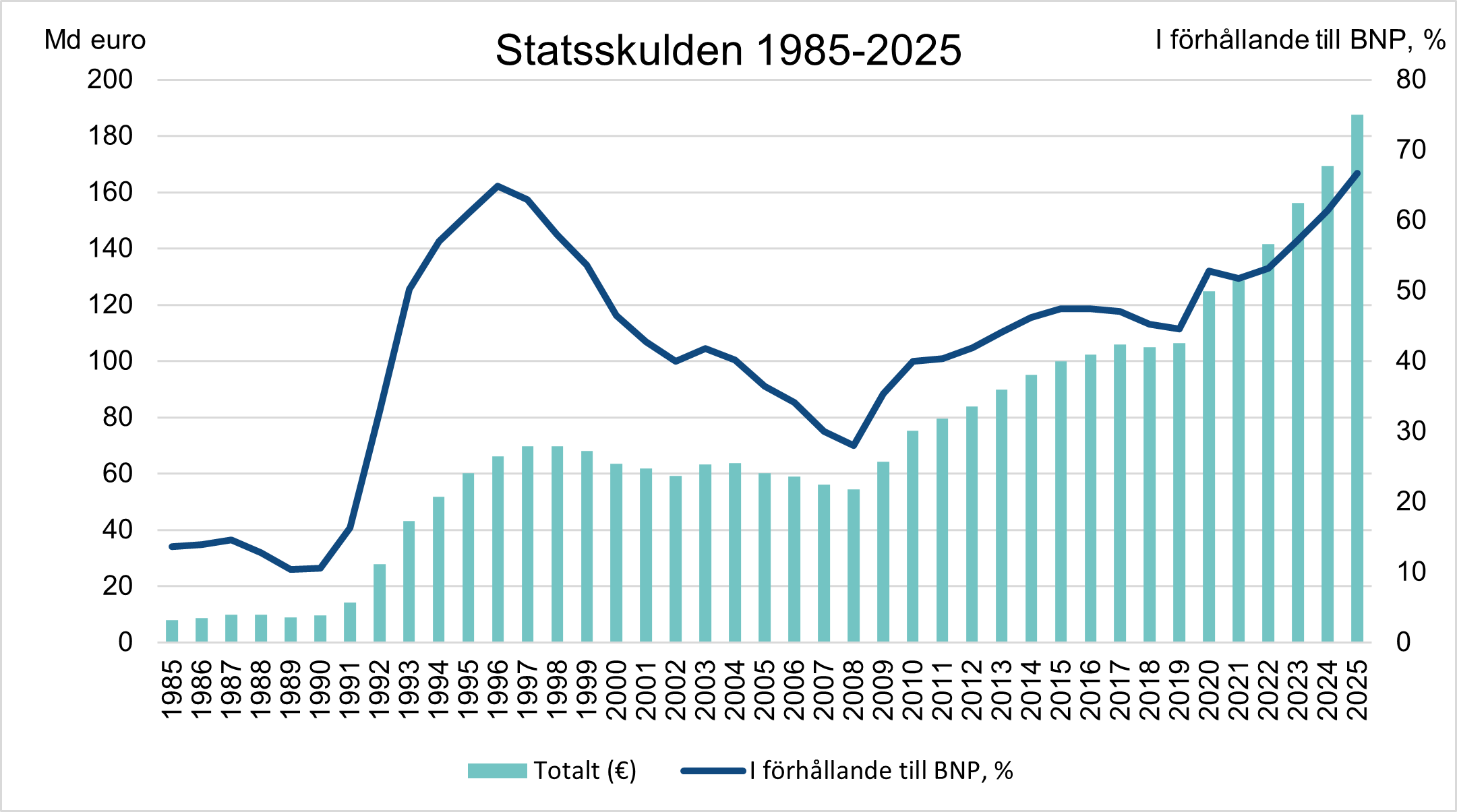 Finlands statsskuld i förhållande till BNP var 66,7 % i slutet av 2025. Finlands offentliga skuld i förhållande till BNP var 89,1 % i slutet av 2025.*